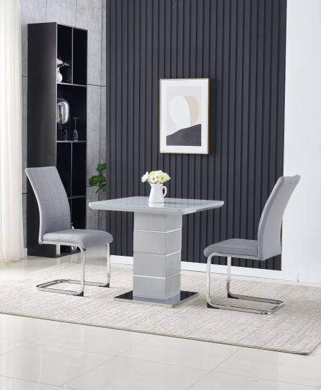 MDF & tempered glass table top in Light Grey. Pedestal in Light Grey with Chrome trim. Base in Modern Chrome. Comes with 2 Light Grey Charlene Chairs.