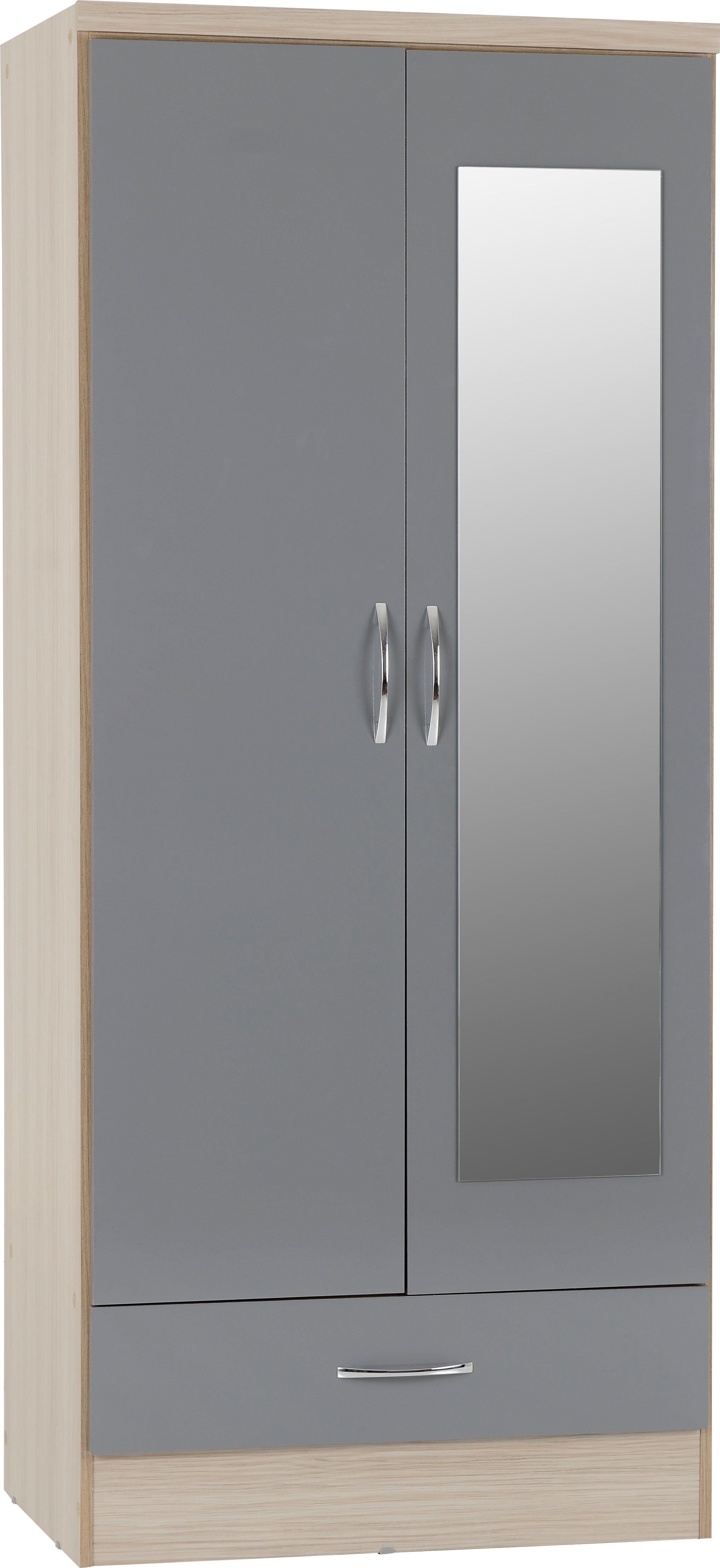 Nevada Mirrored 2 Door 1 Drawer Wardrobe Grey Gloss/Light Oak Effect WS